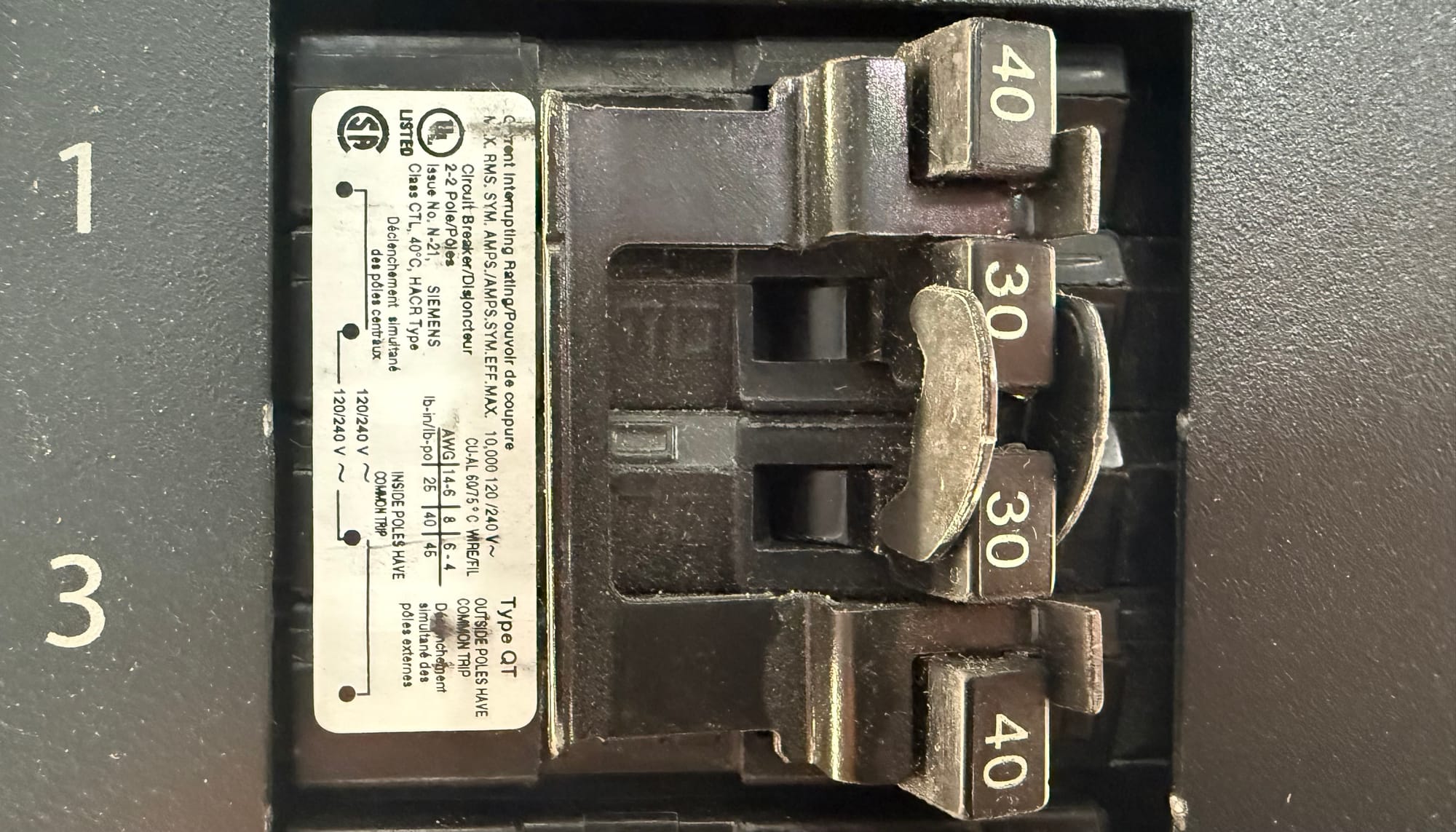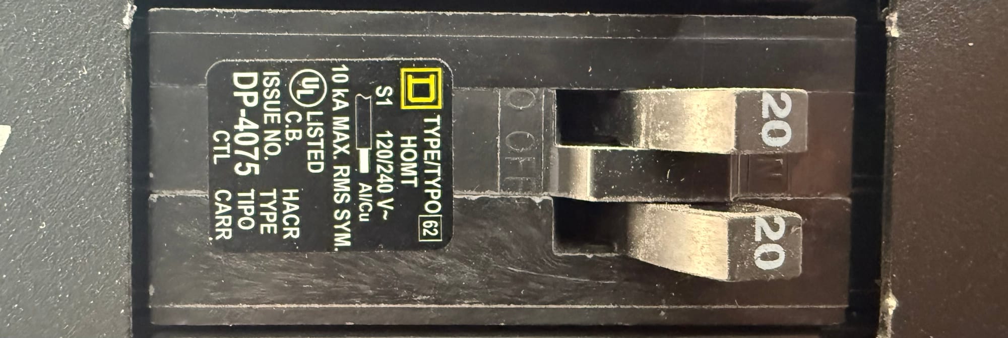 Tandem circuit breaker for 2x 120v circuits (left) and Quad circuit breaker for 2x 240v circuits (right)
