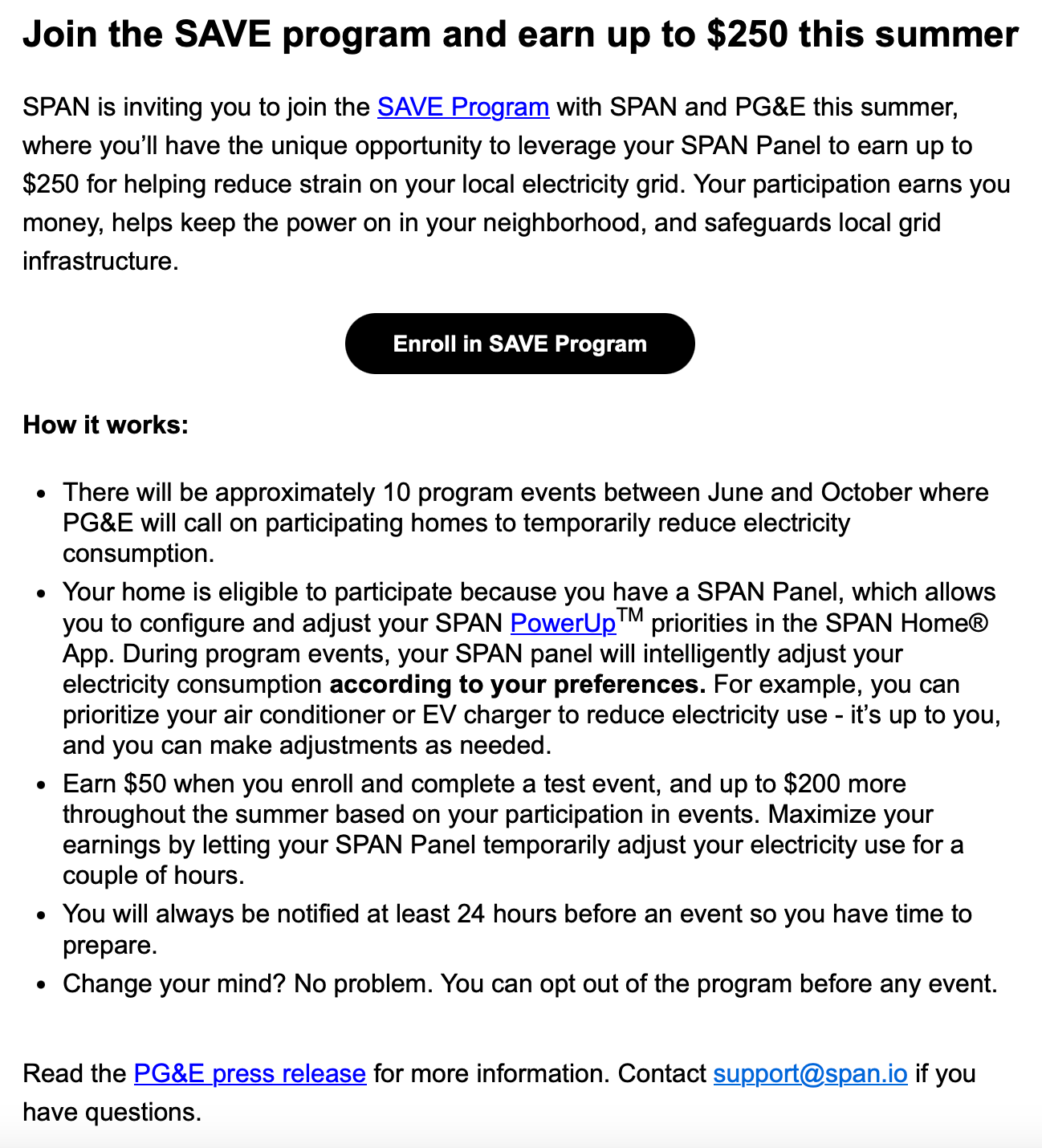 Span calls their program PG&E’s SAVE program - and offers up to $250 for participating in 10 events with the SPAN panel installed in my home called on to reduce electricity usage: