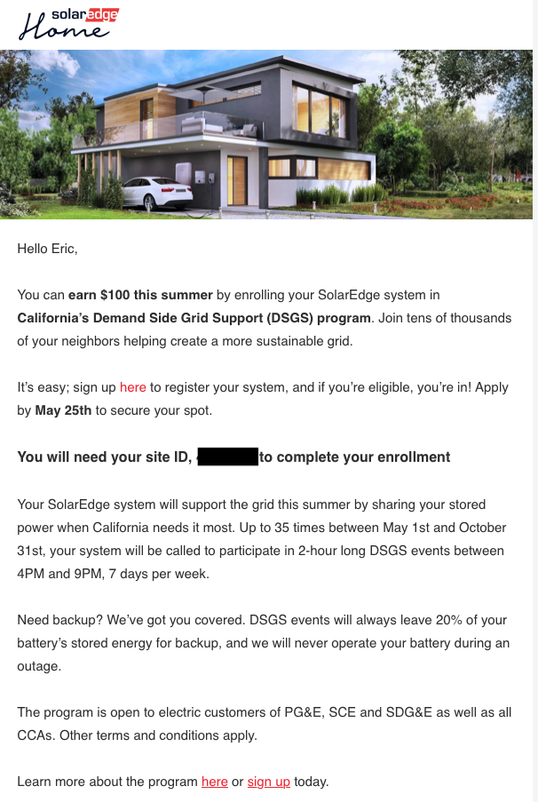 SolarEdge calls their program California’s Demand Side Grid Support (DSGS) program - and offers $100 for participation in up to 35 events, with my battery: